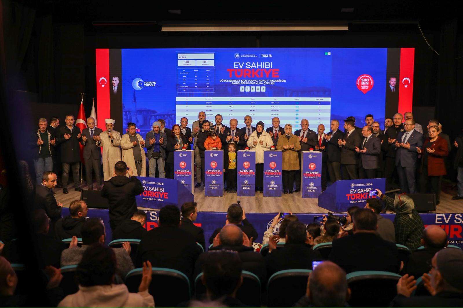 Kura çekimi de, Düzce Merkez’de bin 300, Akçakoca’da 250, Cumayeri’nde 200, Gümüşova’da 200, Çilimli’de 180, Kaynaşlı’da 150, Gölyaka’da 100 ve Yığılca’da 90 konutun hak sahibi belirlendi.
