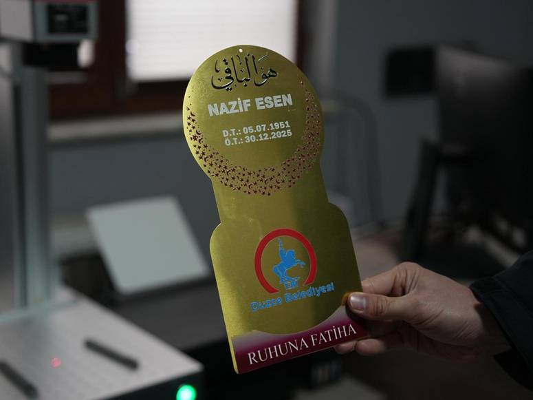 Düzce Belediyesi Mezarlıklar Müdürlüğü, defin hizmetlerinde yaşanan bir soruna da kalıcı çözüm getirdi. Daha önce yalnızca ahşap mezar başlıkları kullanılırken, müdürlük bünyesine kazandırılan lazer baskı makinesi sayesinde metal plakalar üzerine baskı yapılmaya başlandı. Yeni uygulamayla birlikte tüm definlerde ahşap mezar başlıklarına; merhumun adı, soyadı, doğum ve ölüm tarihlerini içeren metal plakalar yerleştiriliyor. Bu sayede hem Mezarlık Bilgi Sistemi’nde yapılan fotoğraflandırmalarda kimlik bilgilerinin yer alması hem de cenaze yakınlarının mezarları daha kolay bulabilmesi sağlanıyor.
